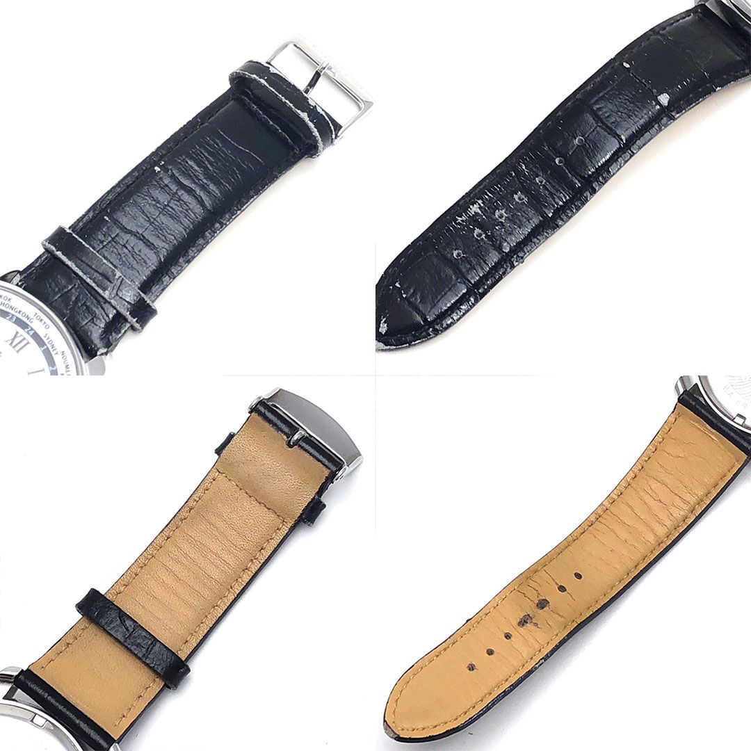 ケース部分に多少のスレキズ、革ベルトは全体的に劣化などのダメージが見られます。全体的には比較的綺麗な状態です。