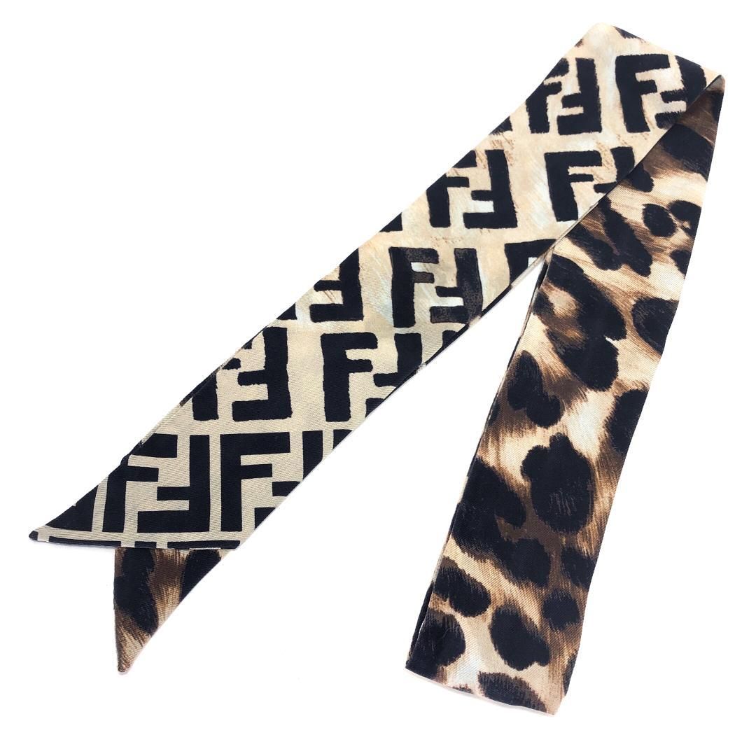 【美品】FENDI フェンディ/FF レオパード ヒョウ柄 ラッピー スカーフ/シルク/ベージュ・ブラック